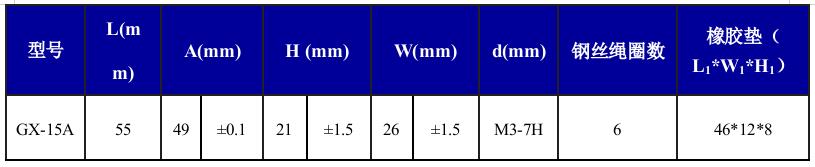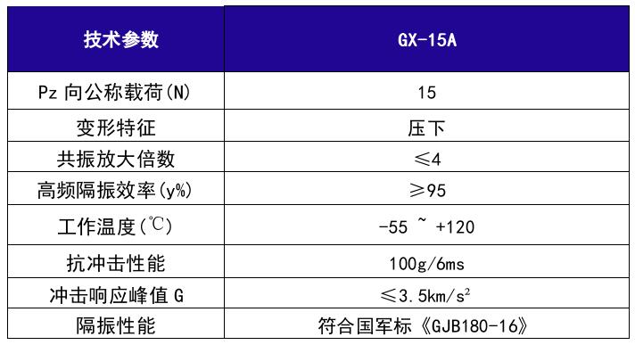 GX-15A型鋼絲繩隔振器Pz向公稱載荷為15N(1.53kg),是在GJB-150推出后,為防止鋼絲繩在強沖擊下屈服失效,在GH型鋼絲繩隔振器基礎上的改進型隔振器,除了可滿足GH型鋼絲繩隔振器的性能之外,其抗沖擊能力也有了大幅度的提高,可滿足高達 100G以上的抗沖擊要求,適用于裝甲車輛、自行火炮、機載、車載、艦載等電子、機械設備、計算機與儀器儀表在高低溫、化學污染等惡劣環(huán)境下的隔振緩沖,導彈衛(wèi)星的運載、導航與發(fā)射系統(tǒng)的安全防護以及各類工業(yè)動力機械的工業(yè)降噪隔振等方面。